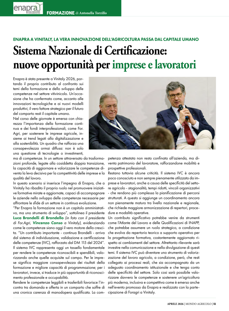 Il focus è sul Sistema Nazionale di Certificazione delle competenze (IVC), tema al centro della partecipazione di ENAPRA a Vinitaly 2026.