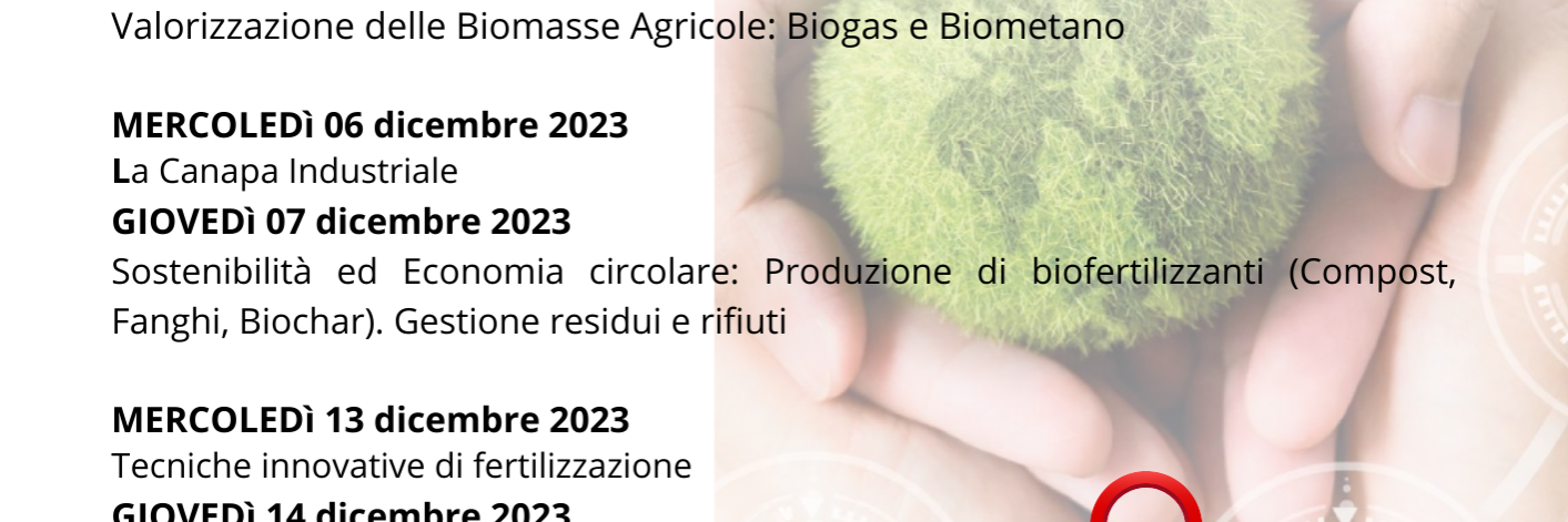 - 07 dicembre: Sostenibilità ed Economia circolare: Produzione di biofertilizzanti (Compost, Fanghi, Biochar). Gestione residui e rifiuti